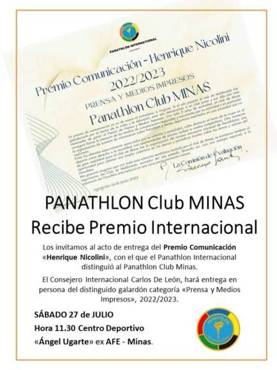 Sábado 27 de julio, el Club Panathlon MInas recibió de manos del miembro de la Junta Directiva Internacional Carlos de León el Premio de Comunicación Henrique Nicolini 2024 en la categoría «Prensa y Medios Impresos».