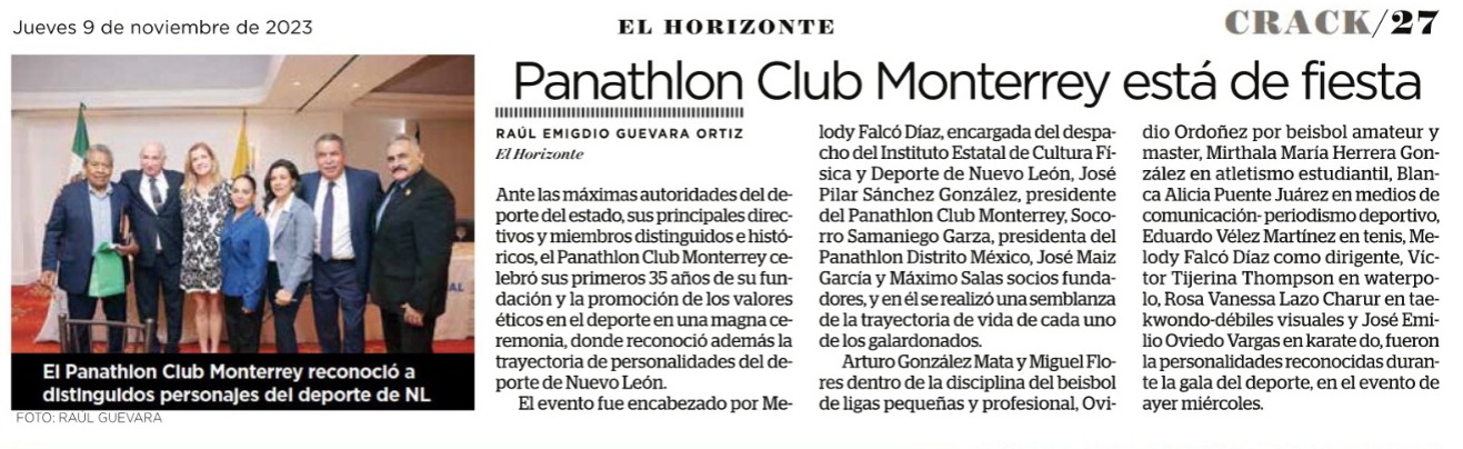 Ante las máximas autoridades del deporte del estado, sus principales directivos y miembros distinguidos e históricos, el Panathlón Club Monterrey celebró sus primeros 35 años de su fundación y la promoción de los valores éticos en el deporte en una magna ceremonia, donde reconoció además la trayectoria de personalidades del deporte de Nuevo León.