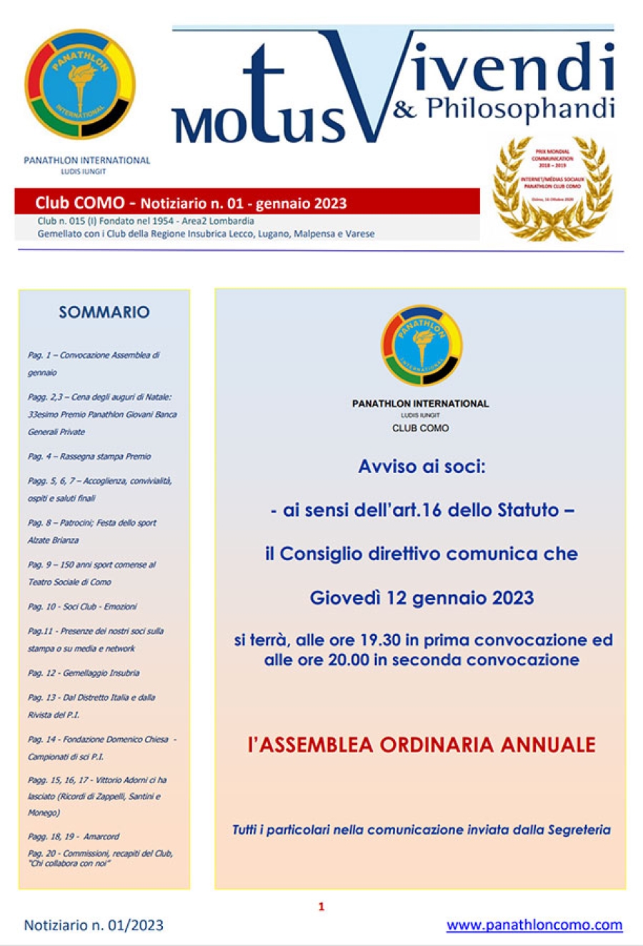 Panathlon International Club Como - Notiziario 01 - gennaio 2023