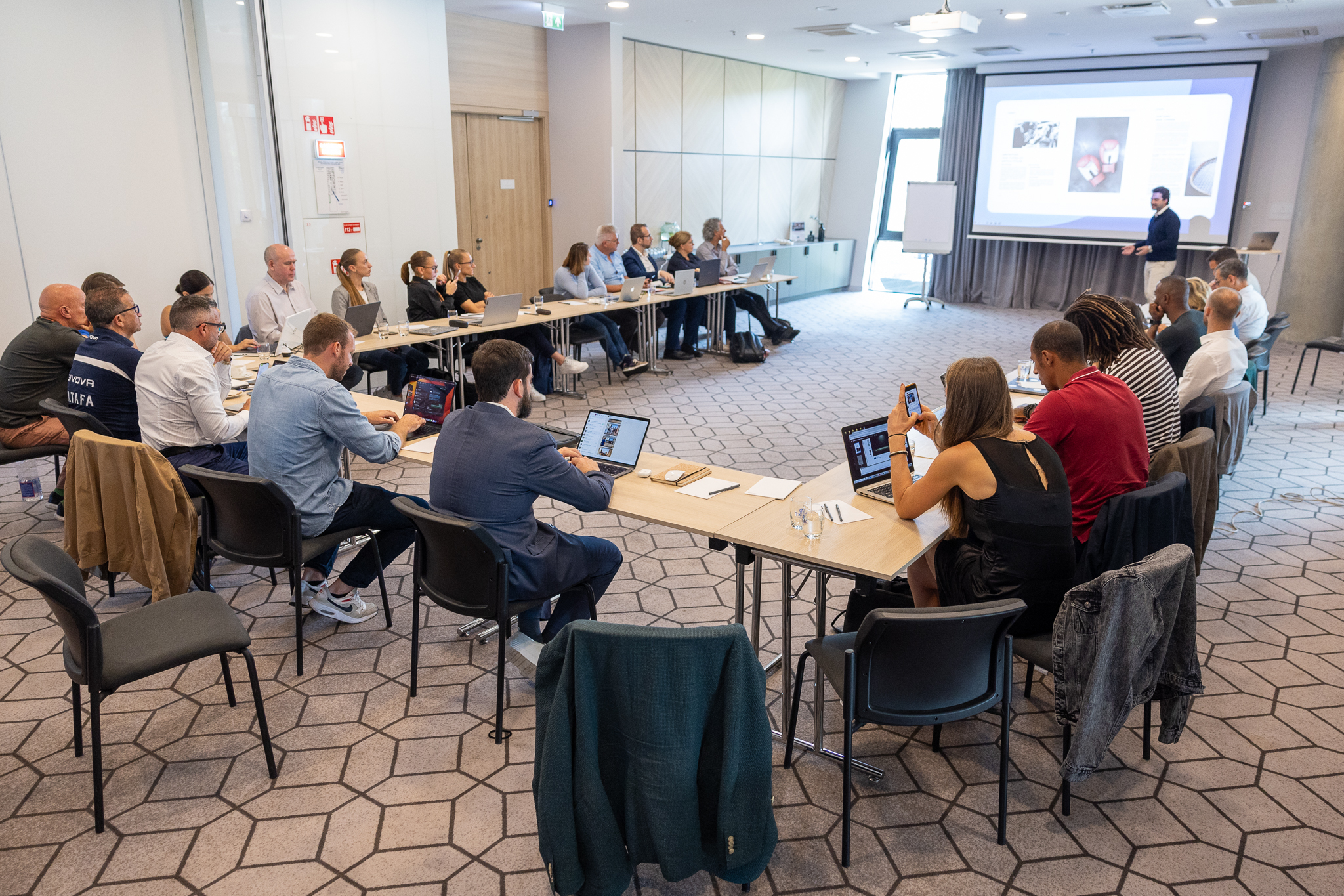 Nach dieser Tätigkeit setzten sich die Partner erneut im Auditorium zur Besprechung der Schlusskonferenz in Lissabon zusammen, die für April 2024 vorgesehen ist. Während der Präsentation wies der portugiesische Fussballverband (Koordinator der Arbeitsgemeinschaft) darauf hin, dass an der Schlusskonferenz Stakeholders internationalen Rufs teilnehmen.