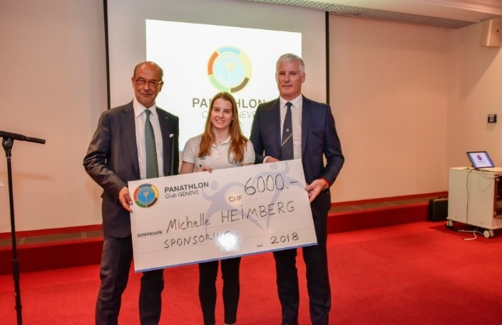 Présentation de la Fondation du Panathlon Club Genève par son président, Olivier Carrard. Un chèque a été remis à Michelle Heimberg, plongeuse soutenue par la Fondation, symbolisant le millionième franc versé à un athlète depuis 1996. Entre-temps Michelle Heimberg a remporté la médaille de bronze aux championnats d’Europe à Kiev.