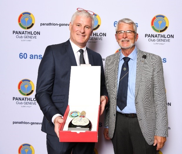 Nicolas Betschart, du Panathlon Club de Zoug, en signe d’amitié entre les clubs, remet un présent à Eric Monnot, président du PC Genève
