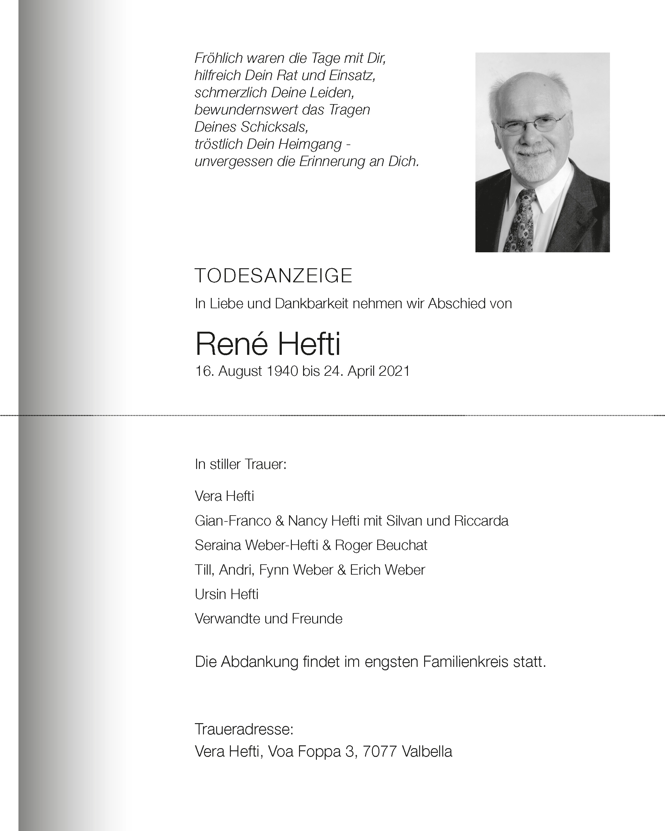 it's our sad duty to inform you that Past-Treasurer and International Board Member of PI René Hefti has left us after a long illness.